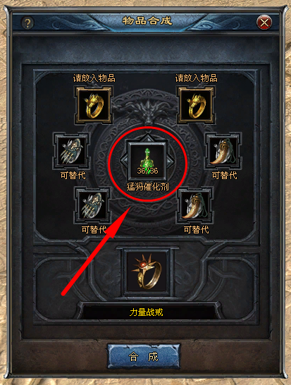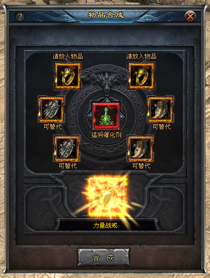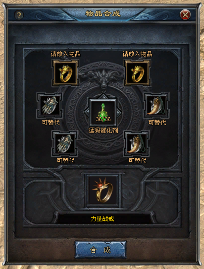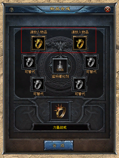 饰品合成 一、使用条件 1、开放节点:深渊饰品合成(日月门开放后) 2、等级要求:玩家等级≥30级 3、合成NPC:魔神龙卫(龙城248,278) 4、合成方式:6件同职业天荒饰品加上若干催化剂的辅助,即可100%合成猛犸级饰品 二、合成步骤 1、例如:若想用“龙之战戒”,合成战士首饰中更高一级的“力量战戒”,需要在【请放入物品】*2的格子中,放入两个龙之战戒,这两格中的道具不可替代。 2、在下方【可替换】*4的格子中,再放入4个龙之战戒,如果道具数量不足,可以用同职业的“天荒级装备”来替代 最多可替代4个栏位,如下图所示:2个主位龙之战戒,使用了2个幽冥项链,2个幽冥手套作为替代首饰 3、龙之战戒是战士的首饰,因此,若玩家背包中有【猛犸催化剂】,放到中间的【催化剂】格子中。 4、点击【合成】按钮,无需消耗金币,即可100%合成一个“力量战戒” 饰品合成功能会有助想玩好游戏,想提升的玩家,有准确的提升方向, 另外, 在服务器相应首饰爆出奖励数量未达到数量之前,通过饰品合成产出的对应首饰也有爆出奖励标识。 |