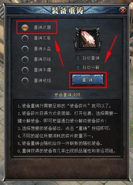| 一、分解装备 在游戏中,如果您打到了一些低级装备,刚好您也用不上它,那就可以把这件装备分解了。分解装备的操作十分便捷,在背包界面就能找到这个按钮: 分解又分为单个分解和一键分解。 ① 单个分解:点击分解按钮,用鼠标去一个个点击背包内不需要的装备进行分解,分解后装备消失,得到装备分解成的装备碎片; ②一键分解:点击一键分解,系统会对您背包内的装备进行分析并且批量分解,分解出装备碎片。一键分解仅对非极品的普通装备生效。对某些高级装备或者极品类的特殊装备不生效,需要单个分解。 在分解高级装备或者极品属性等特殊装备时,会先弹出提示框,确定是否分解,以防止玩家误操作。 二、重铸装备 分解得到的装备碎片有什么用呢?可以用这些装备碎片来进行装备的重铸。重铸就是使用分解装备获得的装备碎片,重新铸造,随机铸造成一件新的装备。重铸的按钮也集成在了背包上,方便玩家随时随地可以进行装备的重铸。 打开背包,点击“重铸”按钮,弹出如下图: 在这个界面下,选择想要重铸的装备部位,点击“重铸”按钮即可,不同的部位所要消耗的碎片数量不一。可以选择重铸的有武器,衣服,护手,靴子,腰带(需要装备碎片125个/次)头盔,项链,戒指,手镯(需要装备碎片75个/次)。 自动重铸、自动分解功能,无需特权,只要年卡用户即可在非洞穴正常使用。 而且在您重铸生成新装备的时候,还有1/30的几率会获得一个随机职业的陨铁石(可以用来给武器镶嵌符纹)。 下面就是见证奇迹的时刻,一件崭新的随机装备诞生了,如果您够幸运的话,还有可能是一件极品装备,那你就赚大了! 注:顶级靴子、腰带,重铸系统也可以重铸出,概率相对较低。 |
